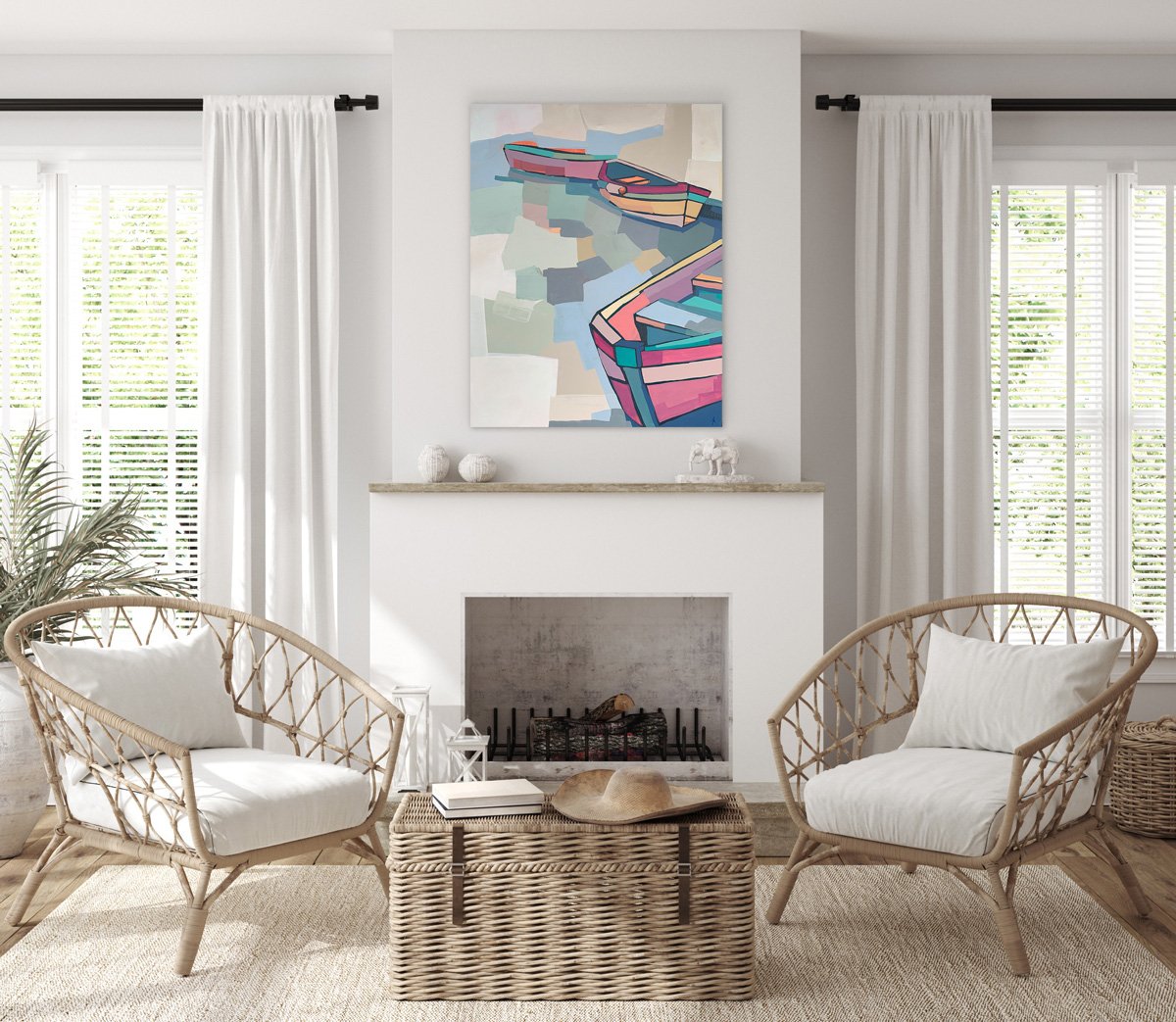 “From my studio in St. Augustine, Florida, I recite the poetry of nature—sounds of the ocean, smells in the air, dappled light on the water, colors warmed by the sun—painting arrangements of tones and shapes that speak of emotions, beauty, and peace,” the artist says of her work. “Inspiration for my style came from an unlikely conspiracy between nature and technology when I accidentally fumbled my camera into the water while capturing a panorama. I was disheartened, but the images on my card were wonderfully broken and distorted, showing me the landscape from a different perspective that deeply resonated with me as an artist and storyteller. Over the years, I have honed and further developed this new way of seeing.