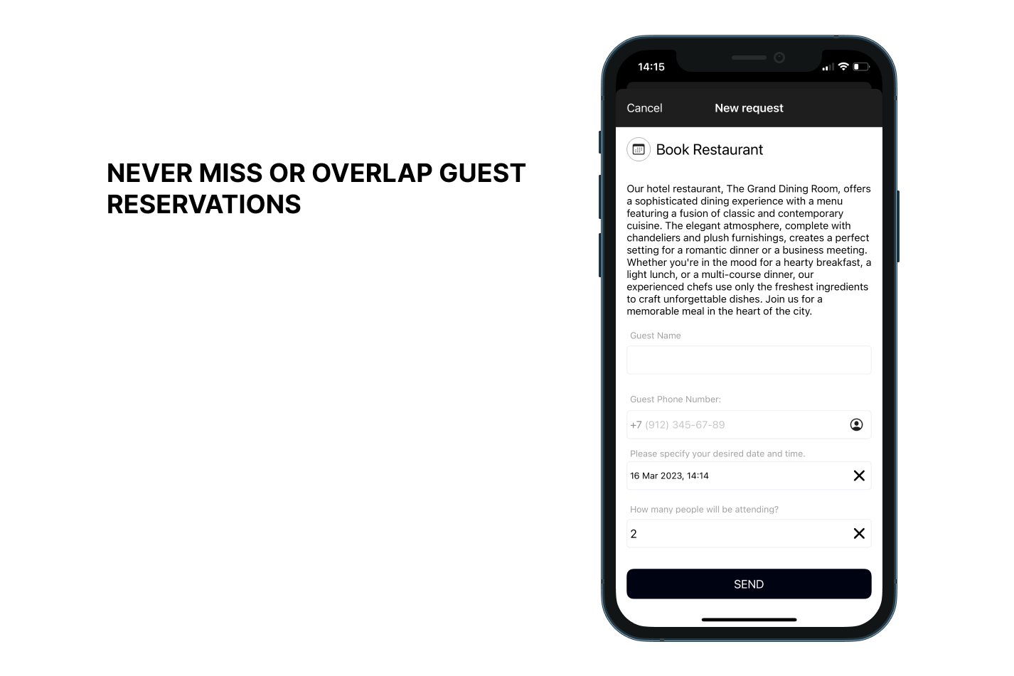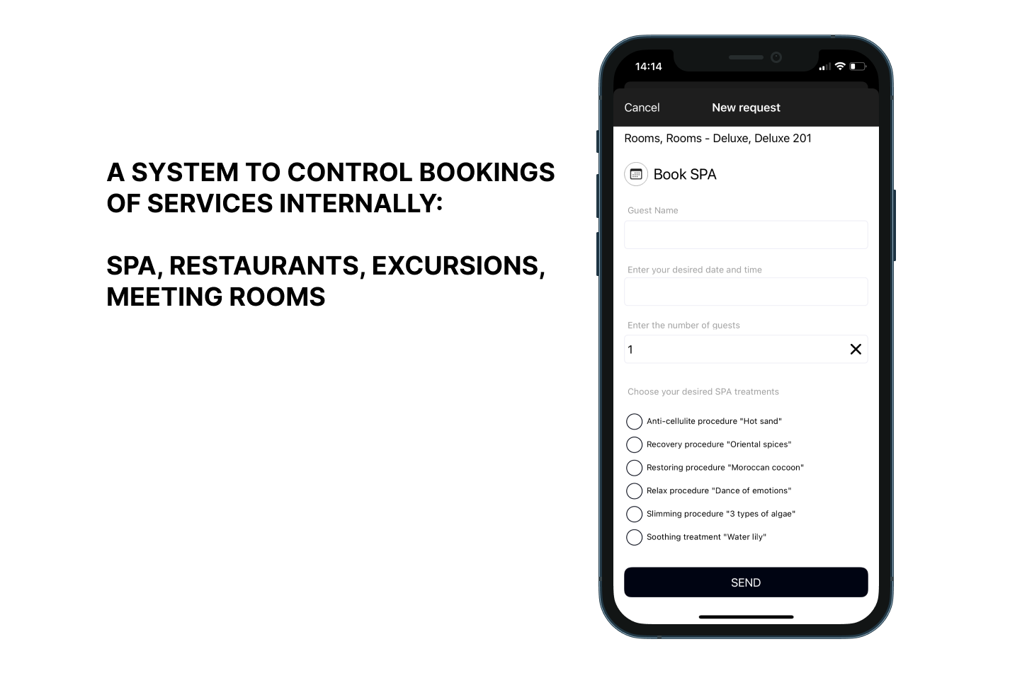 This feature allows hotel staff to book services or hotel spaces for guests. Team members can check available time slots to make reservations for: restaurants, spa, conference rooms, co-working spaces, excursions, airport transfers.