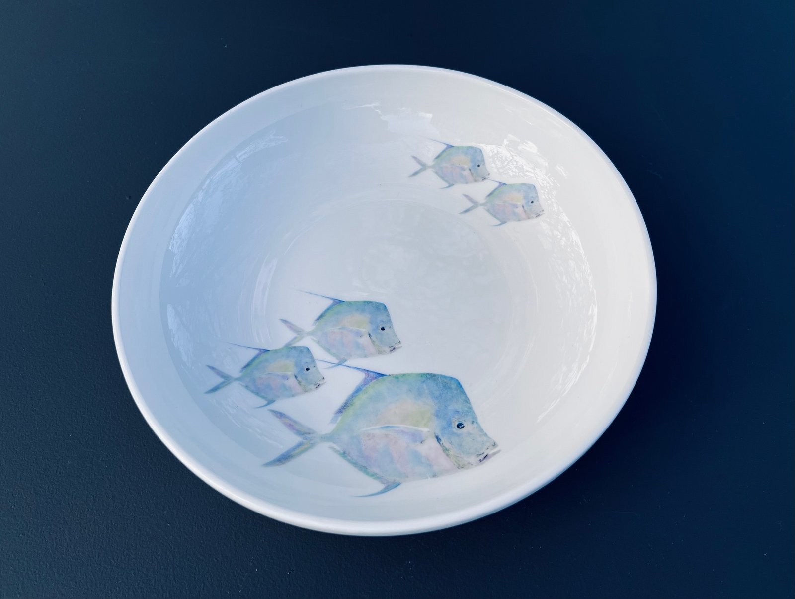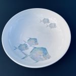 Made in Staffordshire, England, our fine bone china is decorated with our original art taken from nature.  The original art print was taken directly from a lookdown fish, hand coloured then expertly translated onto the bone china using glass pigments, fired into the glaze for a luminous but very durable decoration.