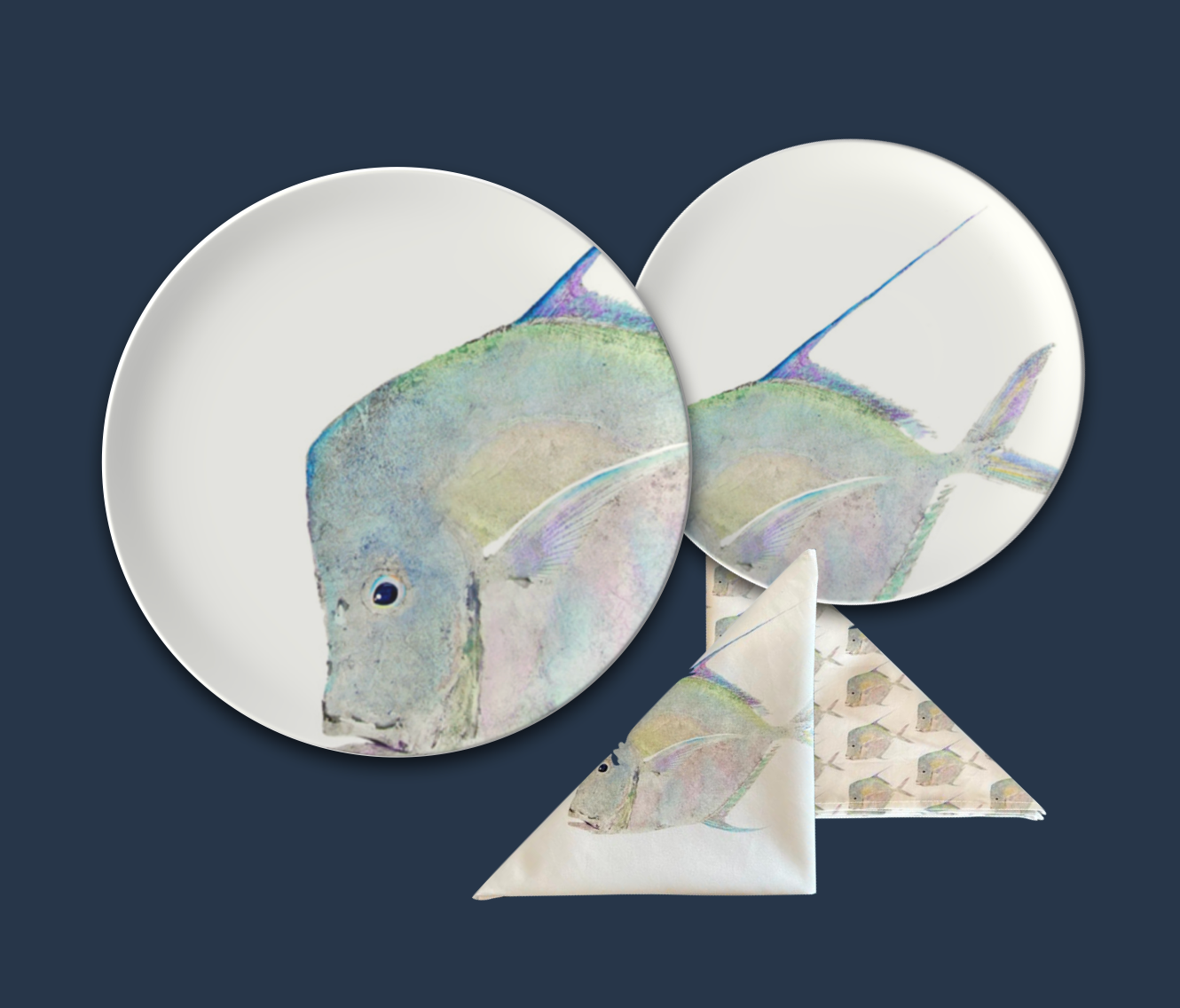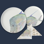 a new collection in development composed of fine bone china tableware made in Staffordshire, England, table linens, even beachwears; for a delicate oceanside resort look. featuring our original art - the lookdown fish collection