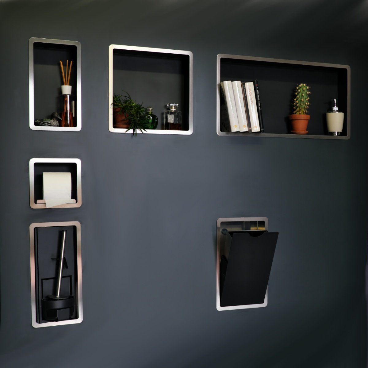 Appear less to be more. Less visibility, more cleanliness and functionality. With its shapes, perfectly integrated within the wall, the stainless retractable brush holder made of steel gives the ideal combination of utility, rationality, discretion and sophistication.