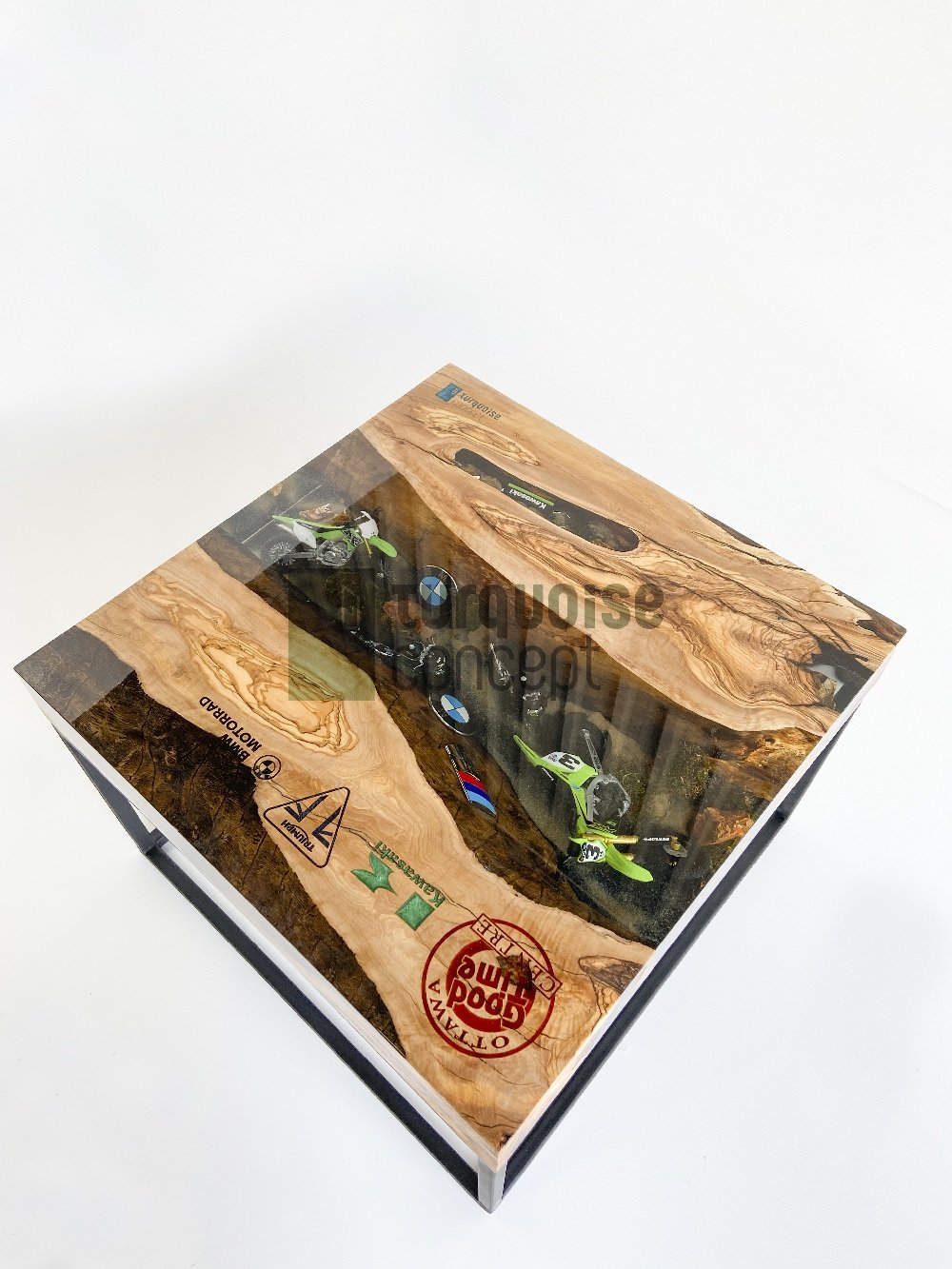 Squared Design Coffee Table with Premium Quality Ultra-Clear Epoxy including some objects to be displayed.