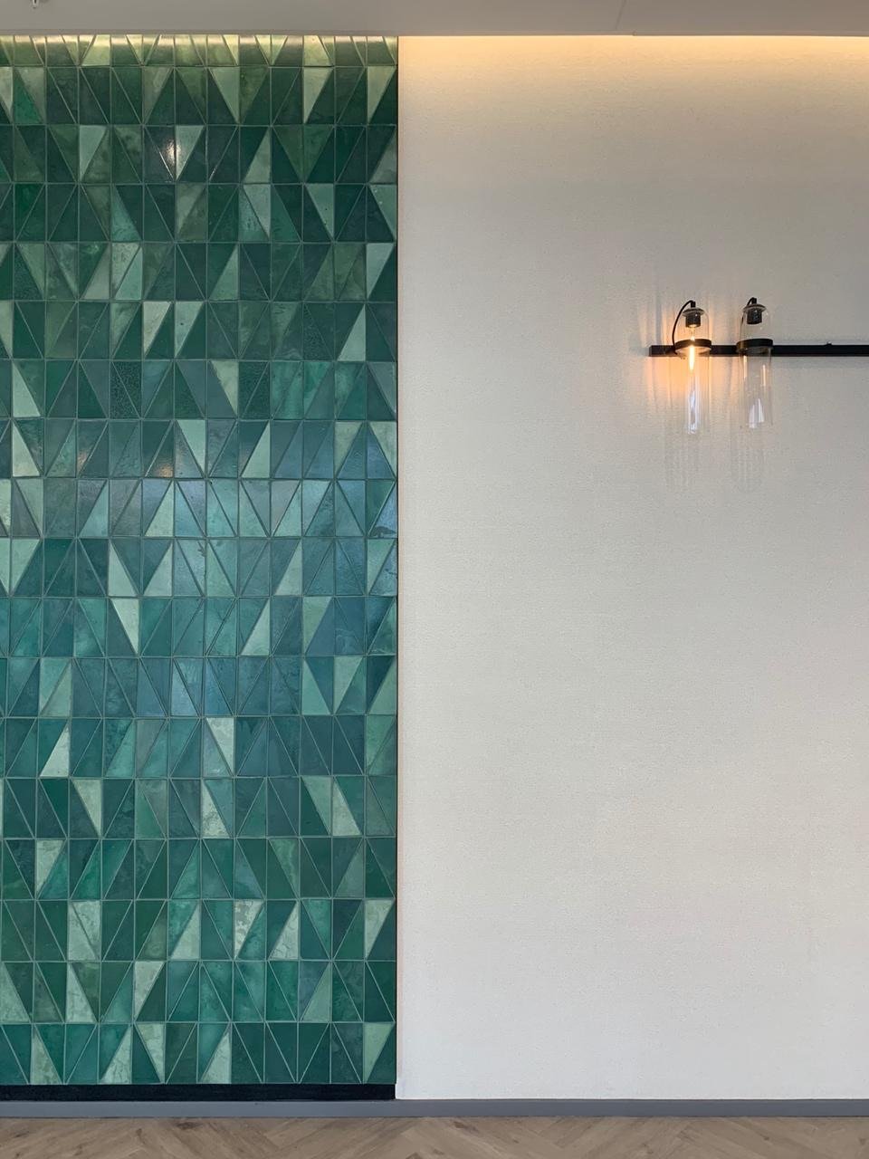 The Lene tile was inspired by a scalene triangle that matches to another in order to create a rectangle.This handmade tile comes in in right and left orientation as a standard and like all our other tiles, can be specified in multiple colours - giving the designer the opportunity to create a unique design.