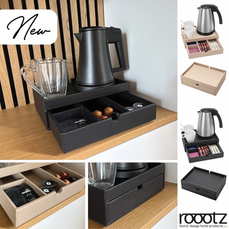 A well-designed hospitality tray has become a standard feature in hotel rooms, allowing guests to conveniently prepare coffee or tea. The Roma tray is designed with this purpose in mind, offering a compact and efficient solution that fits seamlessly into rooms where space is limited. Learn more about the collection on the Roootz website