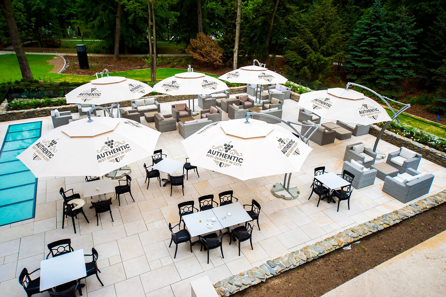 We have created bespoke hotel shade solutions for many clients. Thanks to our technical capabilities we can create new designs for custom projects. We complete comprehensive orders for promotional products or outdoor restaurant equipment – custom hotel umbrellas, awnings, tents, fences, etc.