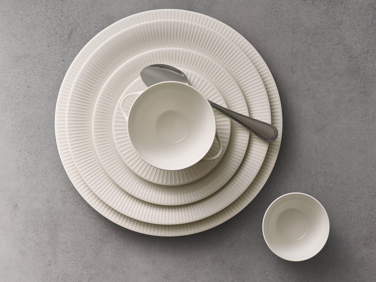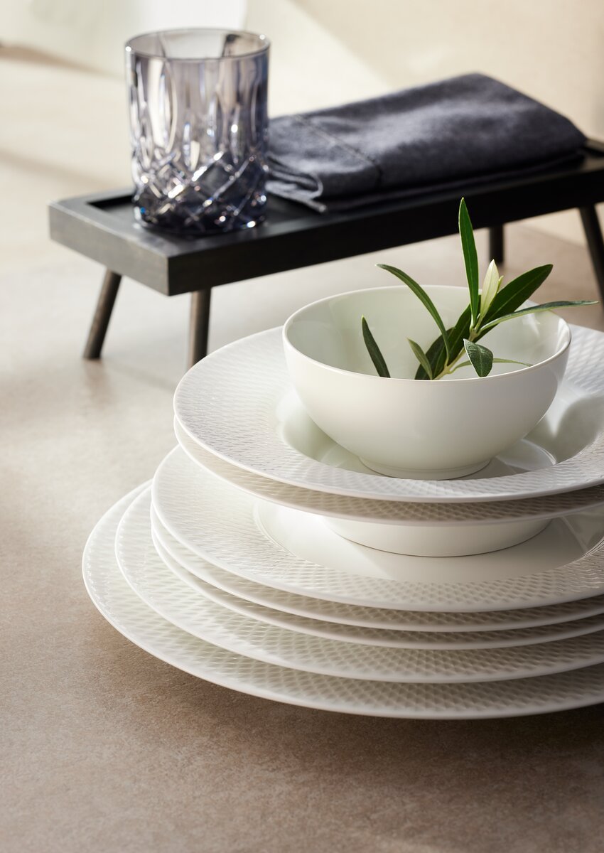 The flatware collection PURITY REFLECTIONS is characterised by an exciting interplay of light and shadow, as the relief on the premium porcelain tableware rims are tangibly raised. In increasingly virtual times, PURITY REFLECIONS enriches food presentation with a sensual tactility that many guests crave. The innovative material, Noble China, renders the premium porcelain tableware both elegant and practical for everyday use. Additionally, the diamond relief showcases the typical properties expected from a professional porcelain manufacturer—good stack-ability of the items is ensured, as well as their hygiene safety.