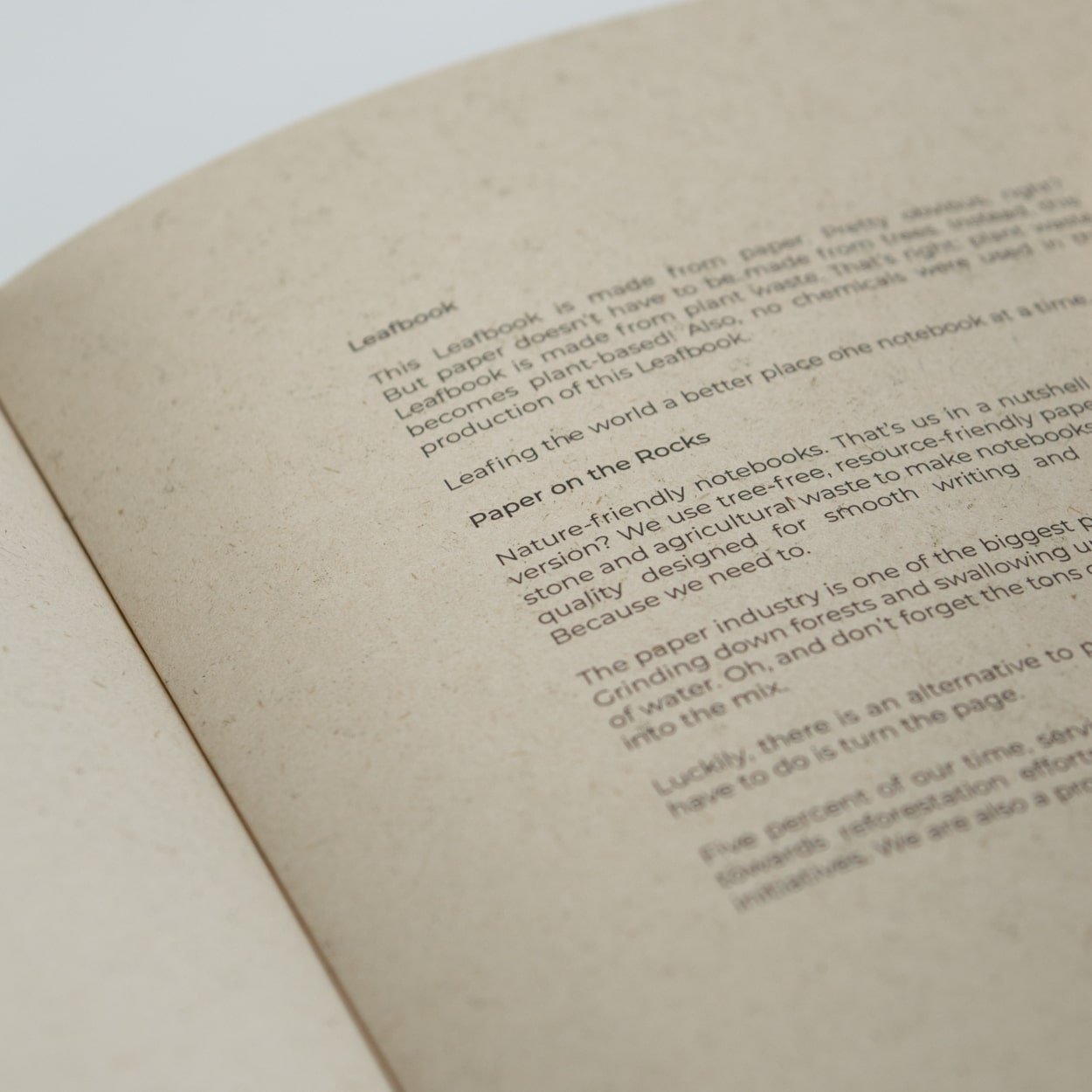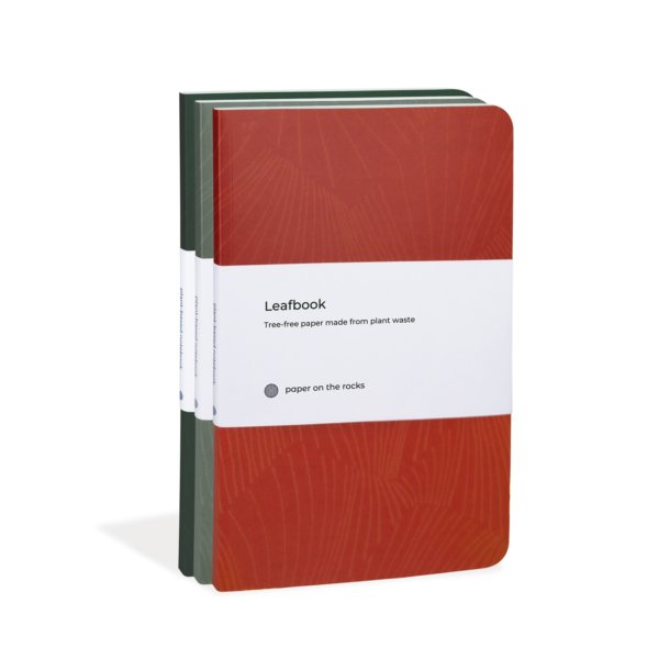 Leaf paper appeals to an eco-minded audience, as the natural fibers show in the paper. It is made from agricultural waste, which means that no trees are cut down for production. Leaf paper can be used to create customized stationary such as Leafbooks, though many other use cases are possible.