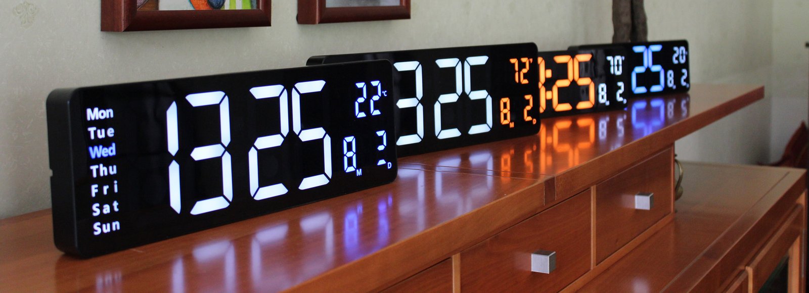 Digital: Digital hotel reception clocks inspired by the LED displays of the 80s, offering features such as Day of Week, Date, Temperature, Alarms, and Stop Watch. Perfect for adorning receptions, lobbies, and corridors with their exciting arrangement of LED colors.