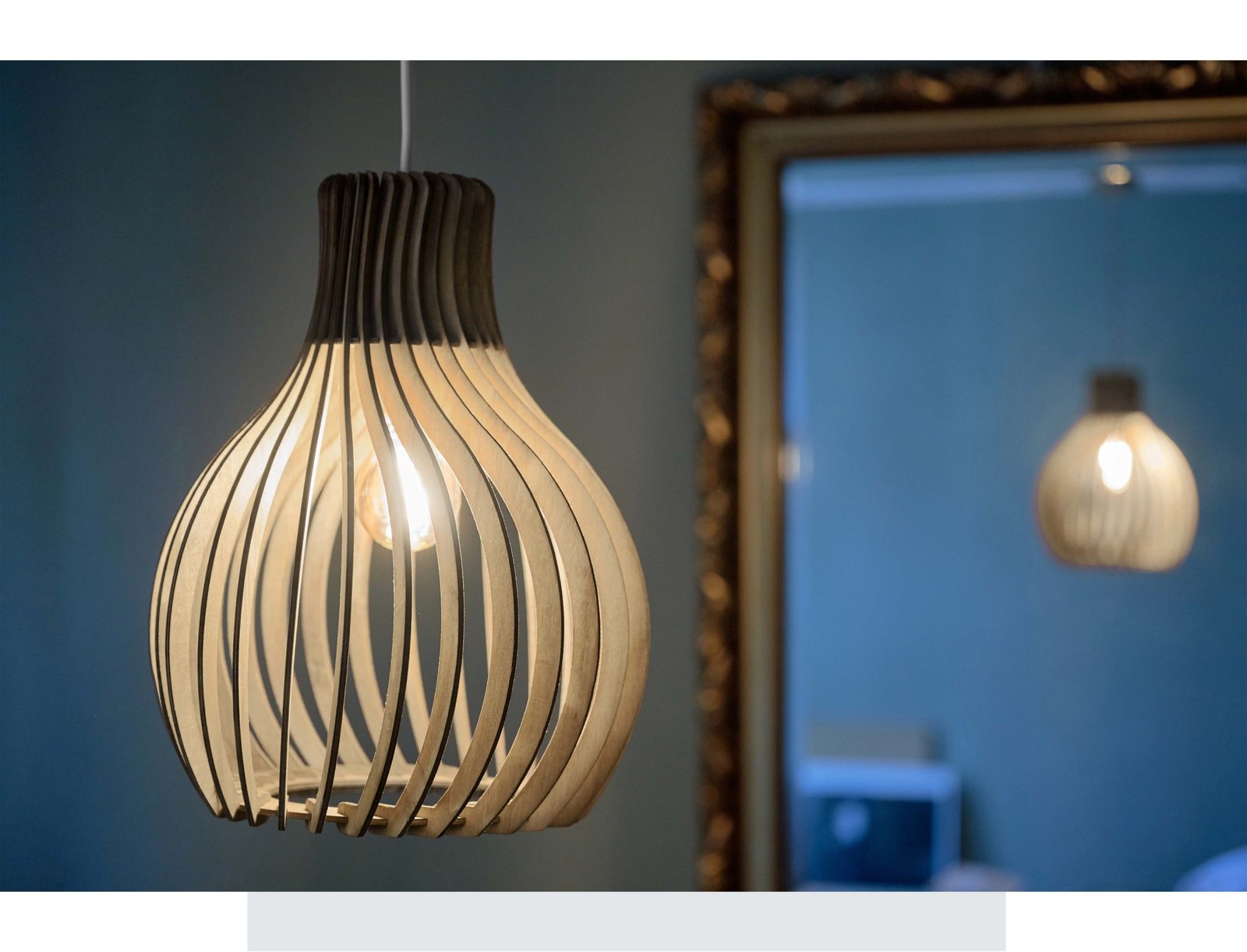 Series 2: Light wood pendant lamps featuring intricate shapes composed of many separate, interlinking wooden parts.