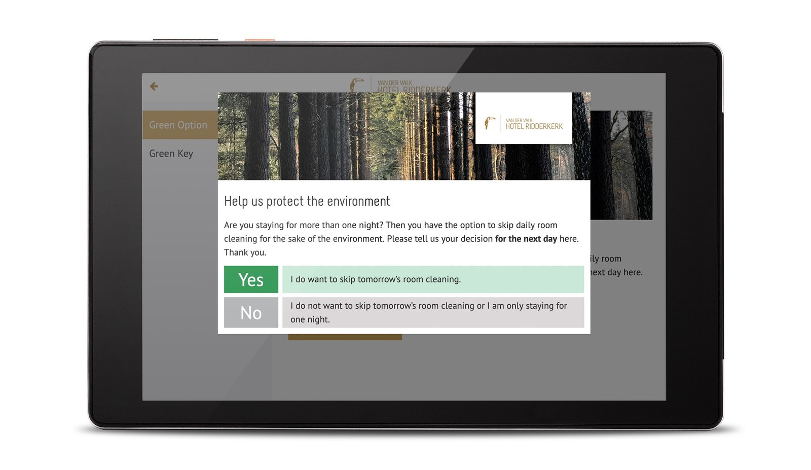 SuitePad’s Digital Guest Directory is perfect for replacing old-fashioned paper-based guest directories. By switching to SuitePad’s digital solution, you can get rid of dirty and high-maintenance guest folders, piles of ageing leaflets, and confusing service directories with something sleek, intuitive, and in-line with the expectations of modern guests. SuitePad’s custom-built backend facilitates smooth hotel guest communication, simplifying the hotel digital communication management of services and orders so staff can concentrate on refining the guest experience. In addition to replacing traditional guest directories, SuitePad’s Digital Guest Directory has additional features that complement the smooth running of modern-day hotels such as the Green Option, which allows guests to forego room cleaning at the push of a button.